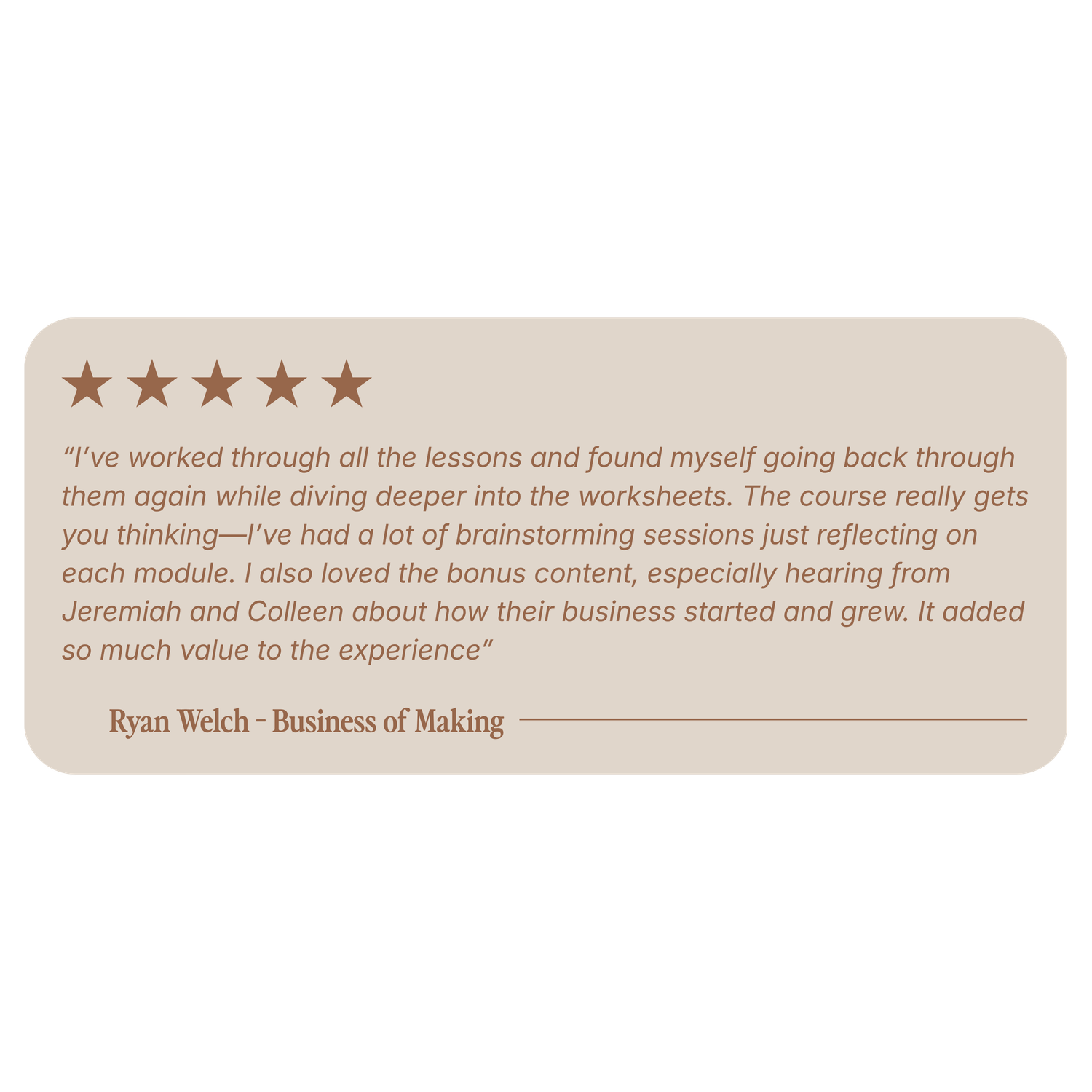 This course is business training designed specifically for makers. It's not vague, one-size-fits-all "business hacks." It's practical, step-by-step guidance you can put to work immediately inside your shop.