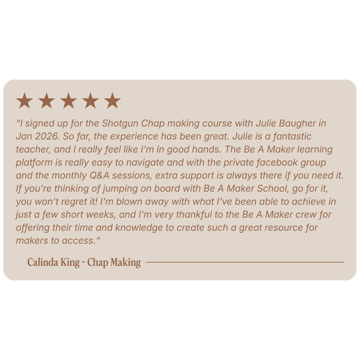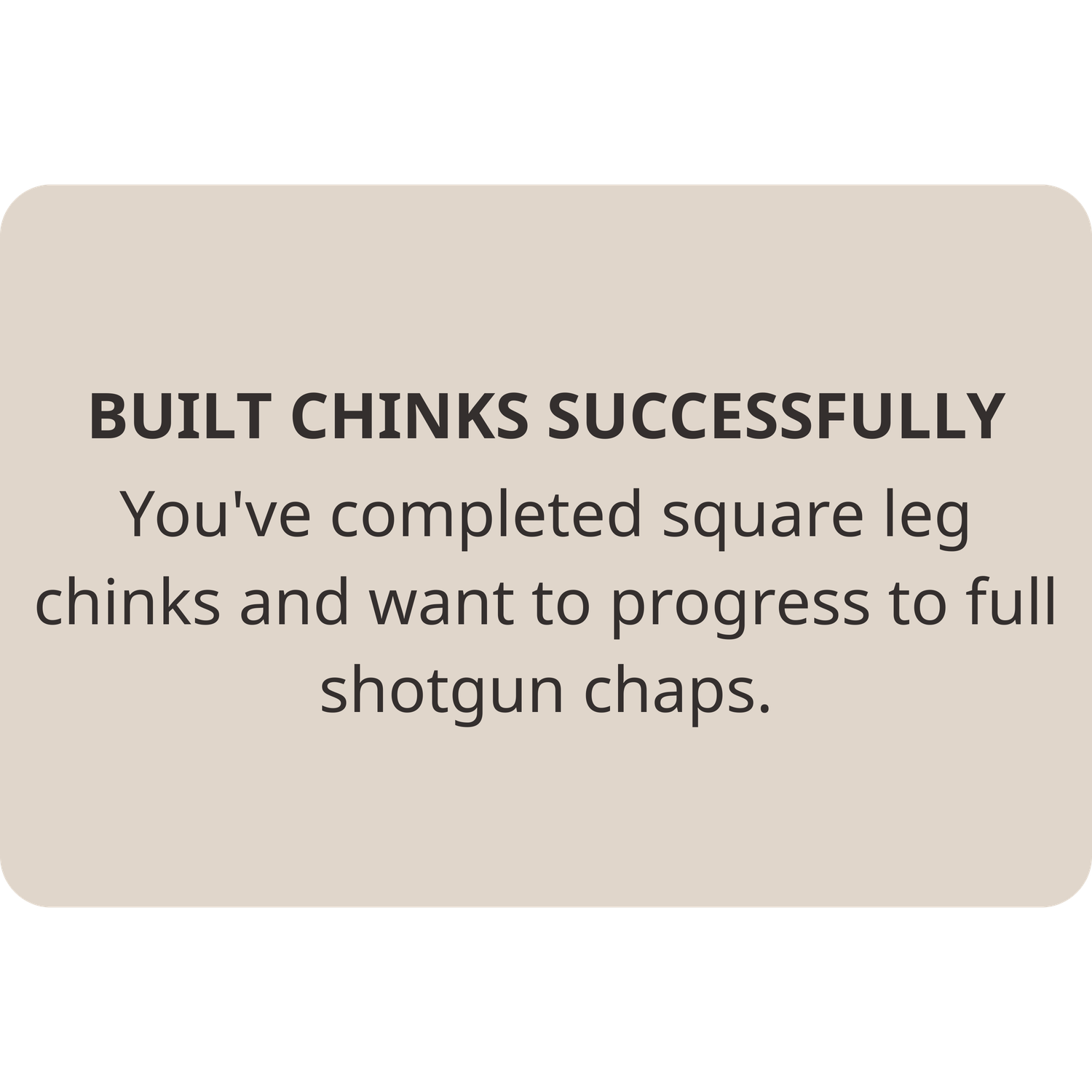 Making shotgun chaps uses the same core tools as chink making, so if you've already taken Julie's Square Leg Chinks course, you have most of what you need.