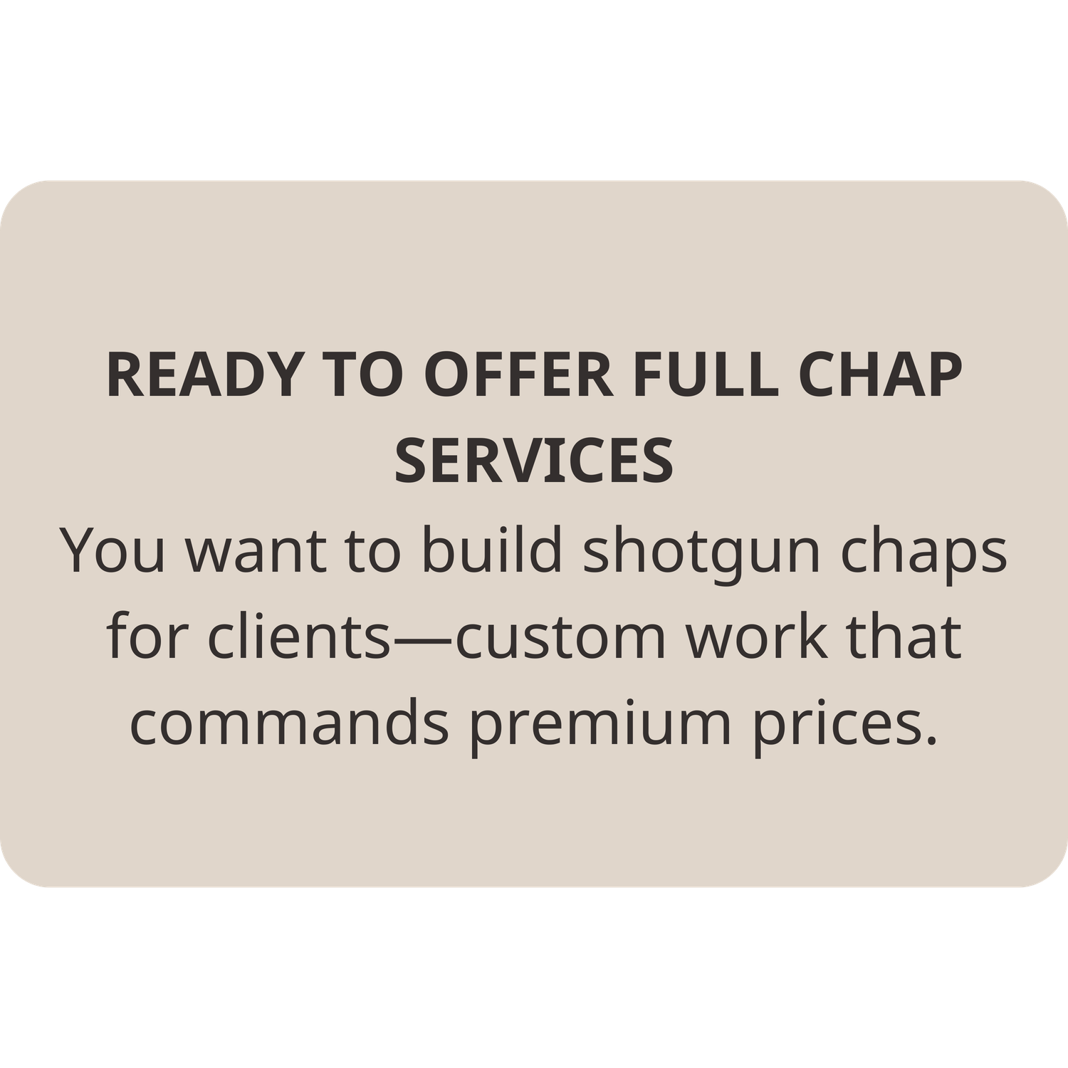 Many finish and realize they can build shotgun chaps for others. Custom full chaps command higher prices than chinks—and there's strong demand for makers who can deliver proper fit and quality construction.
