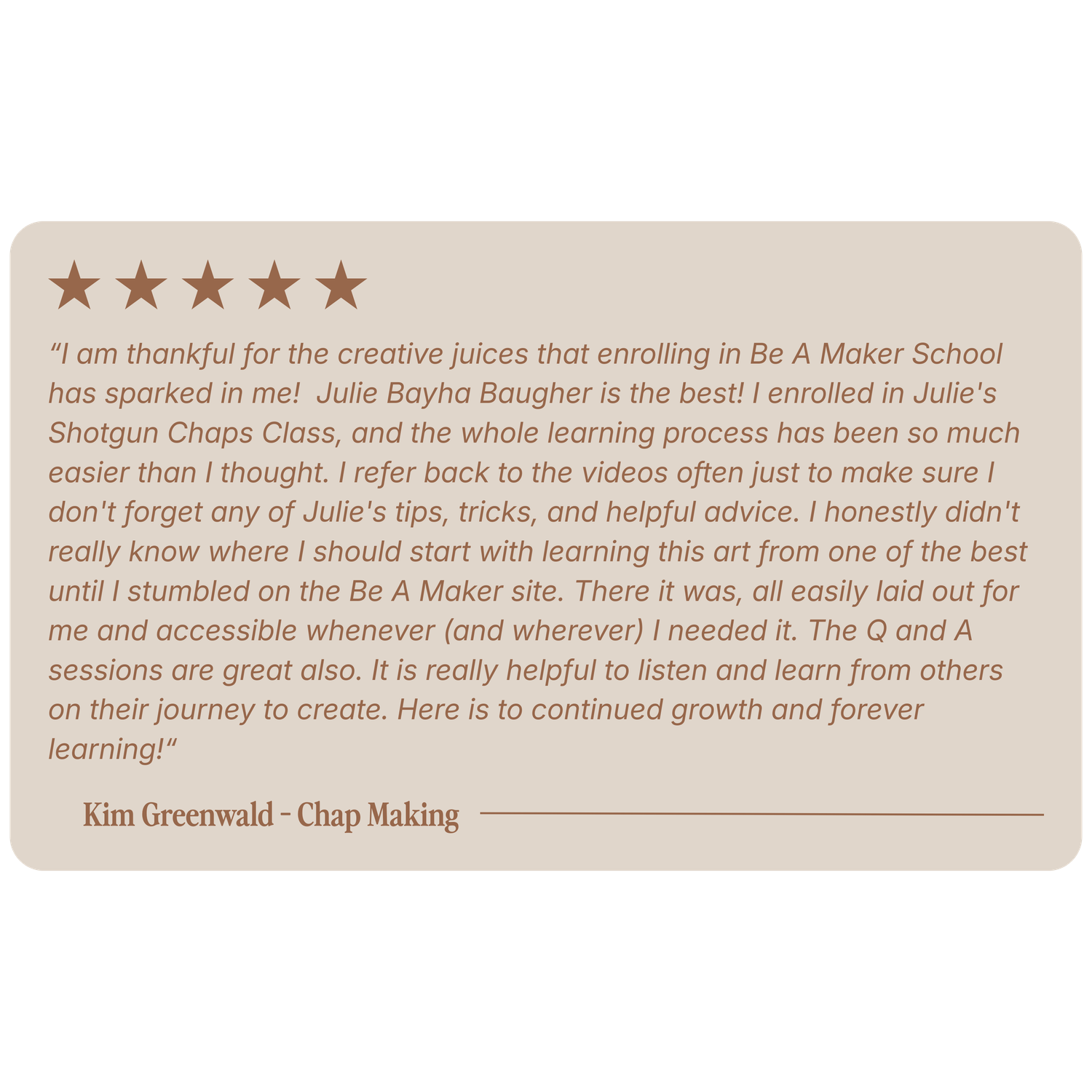 Learn Julie's precise, proven process for building full shotgun chaps. From drafting custom patterns to sewing, zipper installation, and all the way to professional finishing. This foundation gives you the ability to develop your own unique process, style, and elements along the way.