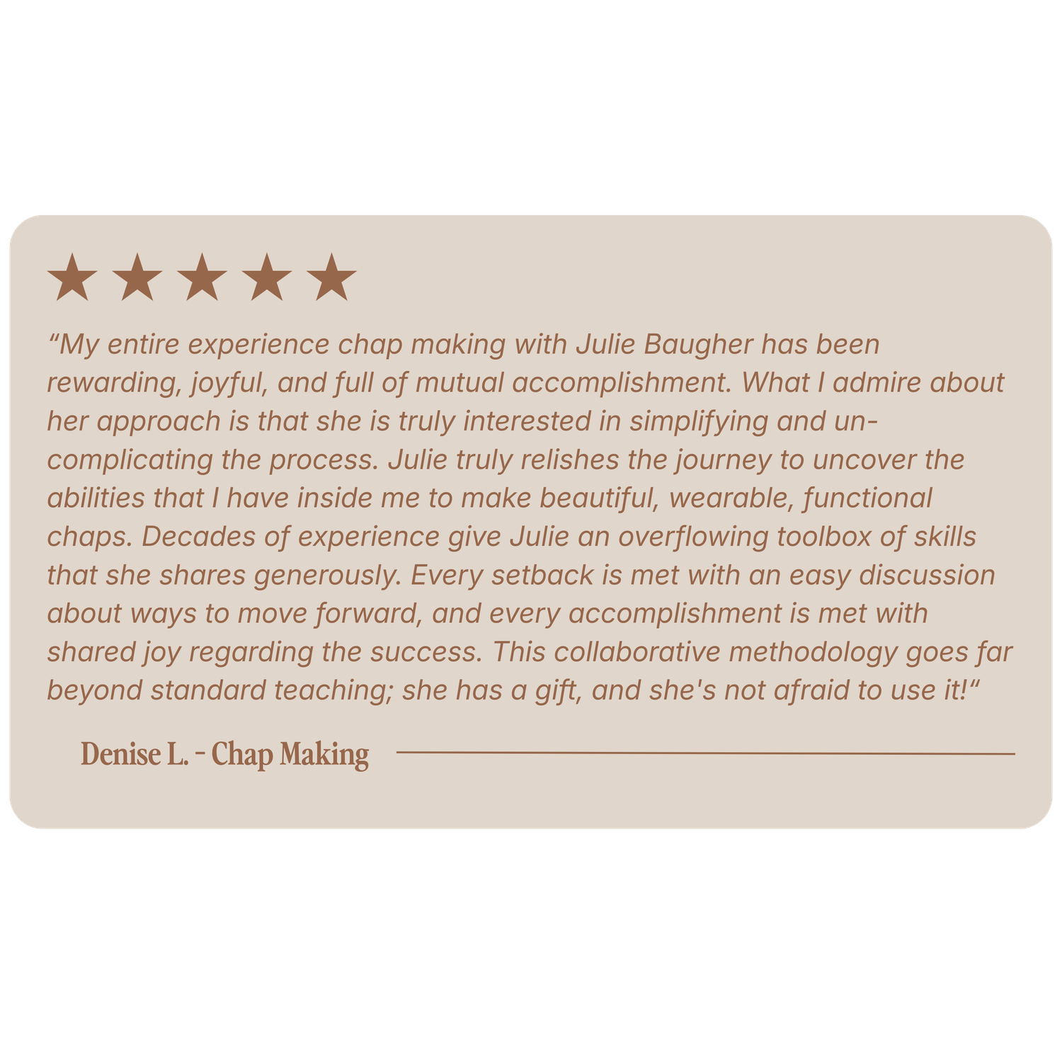 I've been teaching chap making for decades because I truly relish the journey of uncovering the abilities people have inside them to make beautiful, wearable, functional chaps.