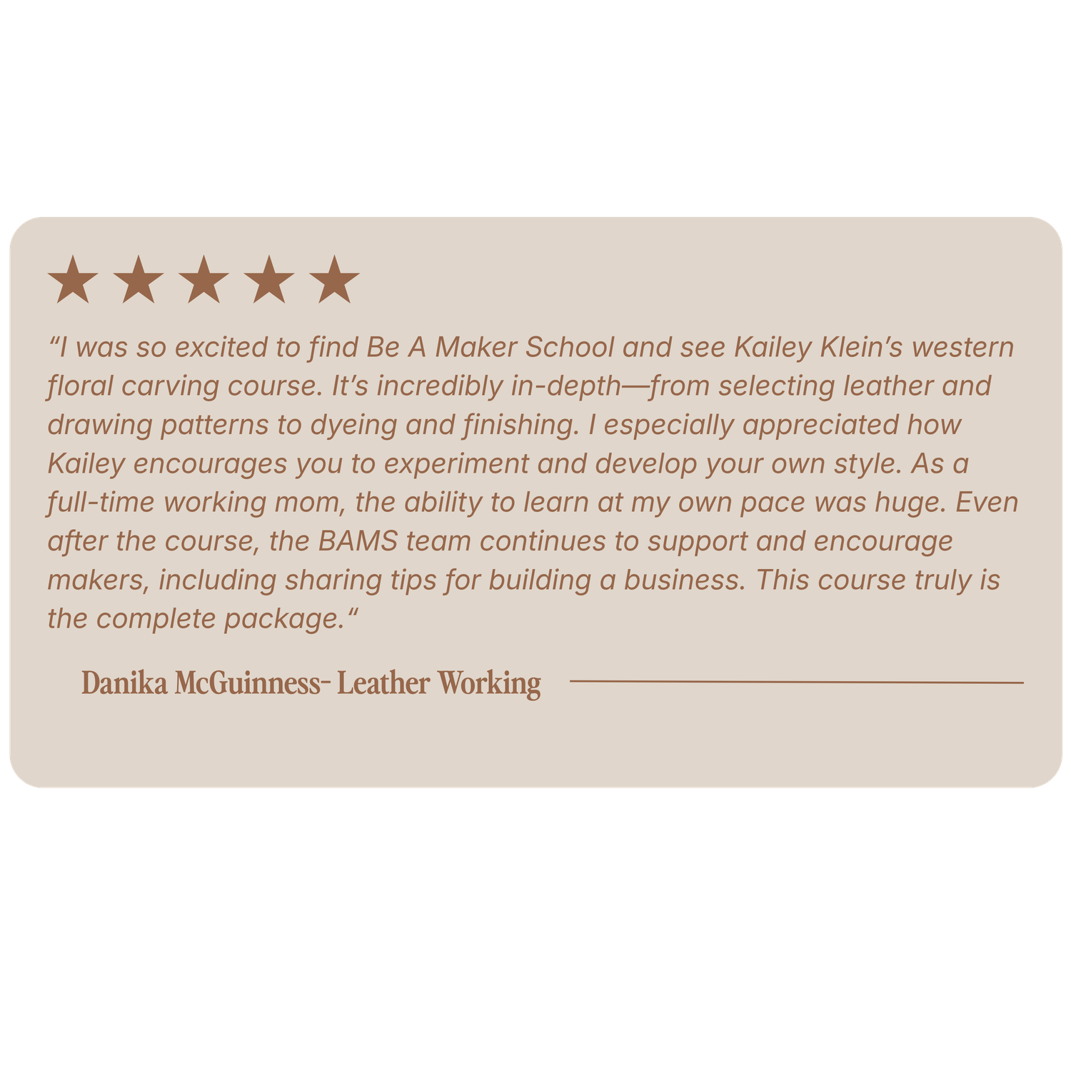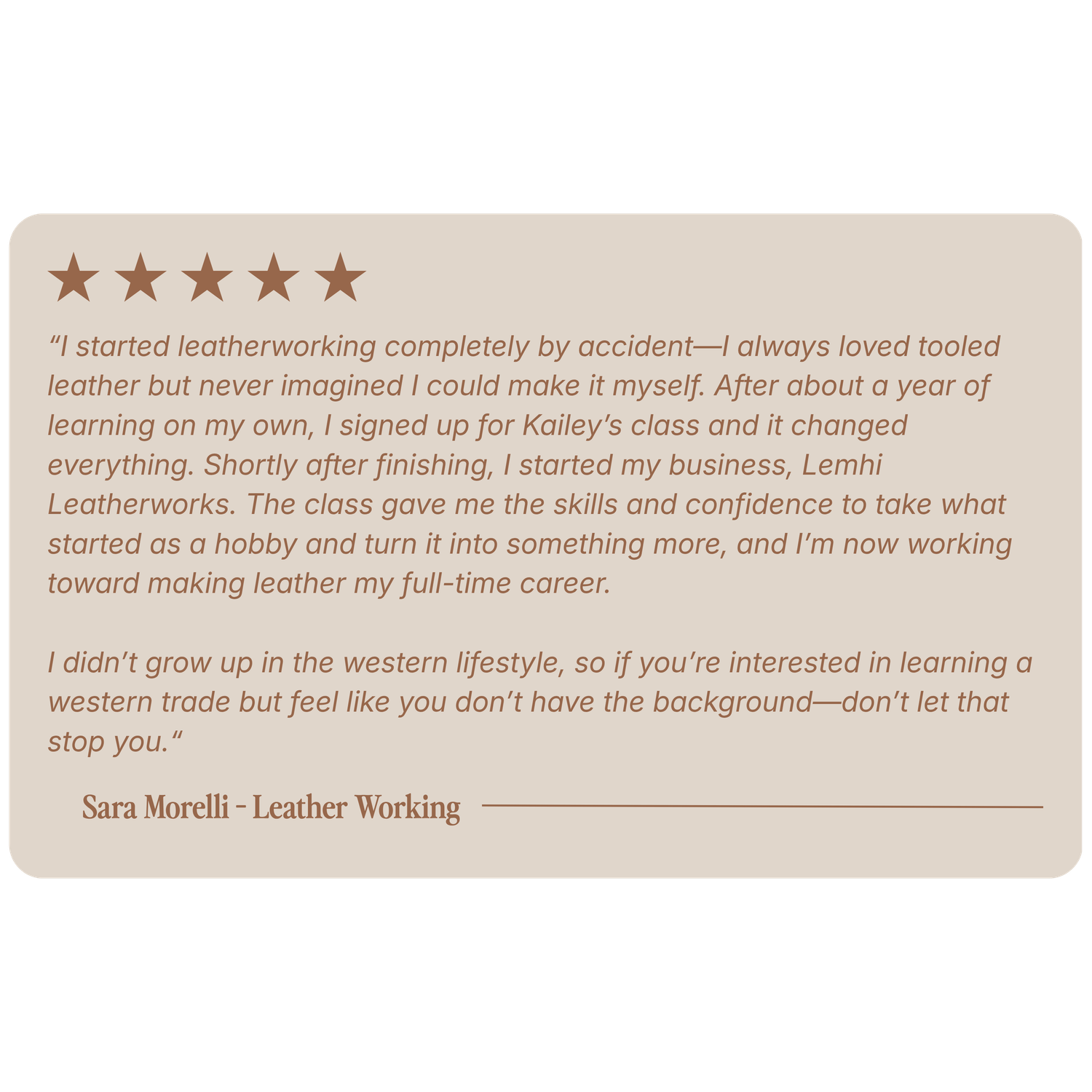 Learn the complete fundamentals of leather tooling—from choosing leather to final finishing—with Kailey's unique blend of traditional technique and contemporary Western style.