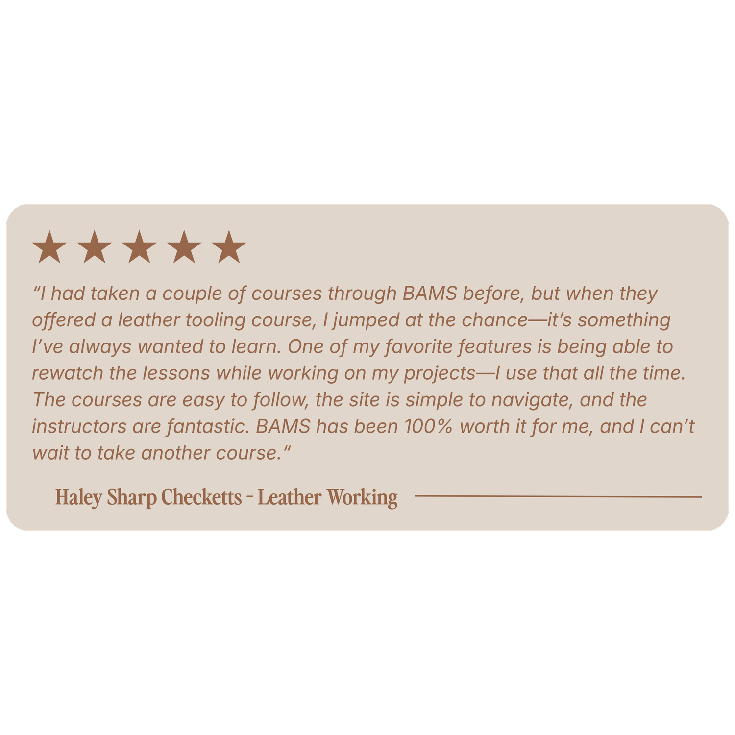By the end of this course, you'll have a toolbox full of skills that will serve every leather project you make for years to come.