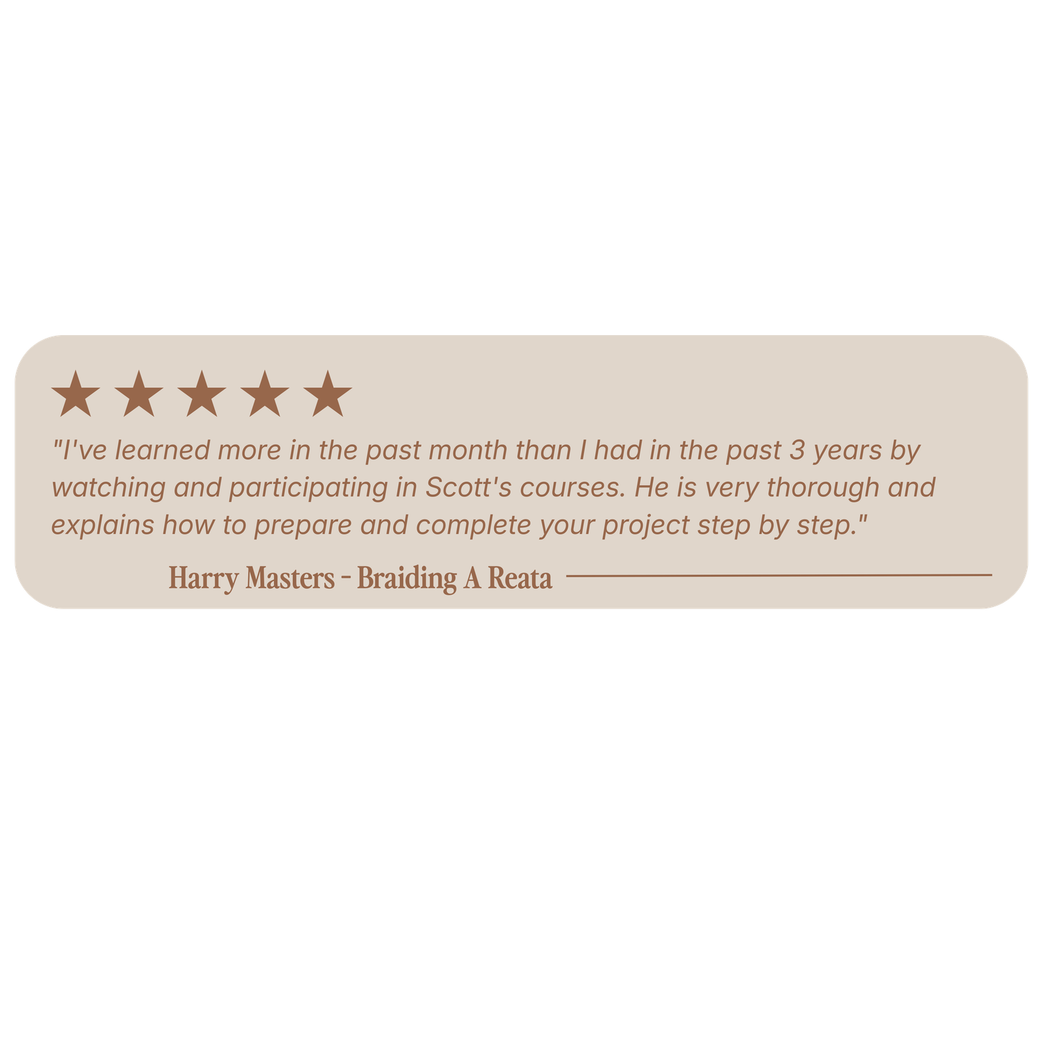 Scott's passion for reatas comes through in every frame of this course. He walks you through the entire process with close-up angles and detailed narration—teaching you not just how to braid, but how to build something you'll be proud to use or pass down.